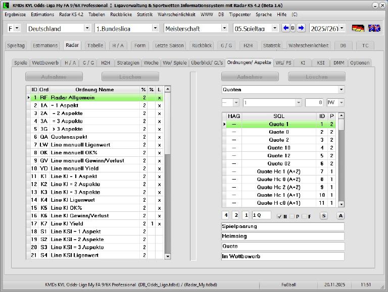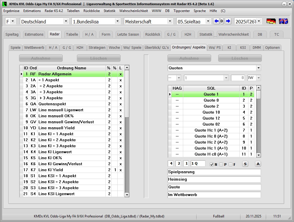 Für User des Sportwetteninfosystems KMD's KVL Odds-Liga My 20 Professional (siehe Hilfe/ Nutzungsbestimmungen der Anwendung) steht nach Fertigstellung eines weiteren großen Projektes, eine professionelle Fußballwetten Analyse/ KI Software mit integriertem Data Mining Tool und weiteren zukunftsforschenden Algorithmen der künstlichen Superintelligenz zur Verfügung - KMD's KVL My Radar als Konzeptstudie 2.9 -, die nahezu keine Wünsche offen lässt (ggf. sind Beta-Testversionen schon vorab erhältlich).
